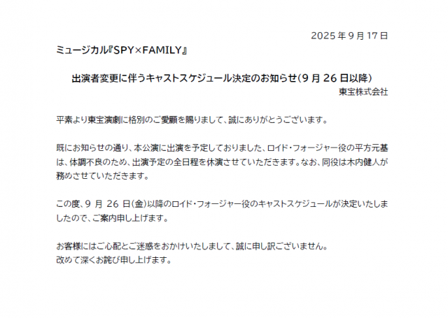 ミュージカル「SPY×FAMILY」平方元基 休演と