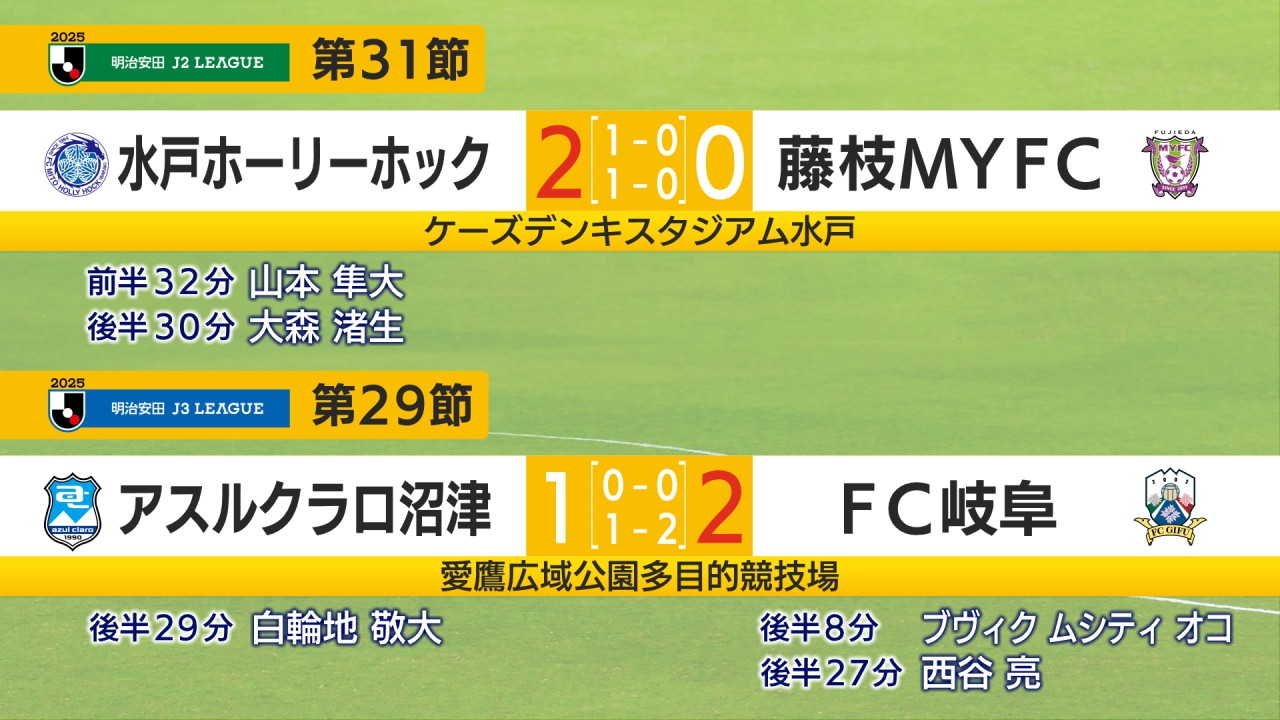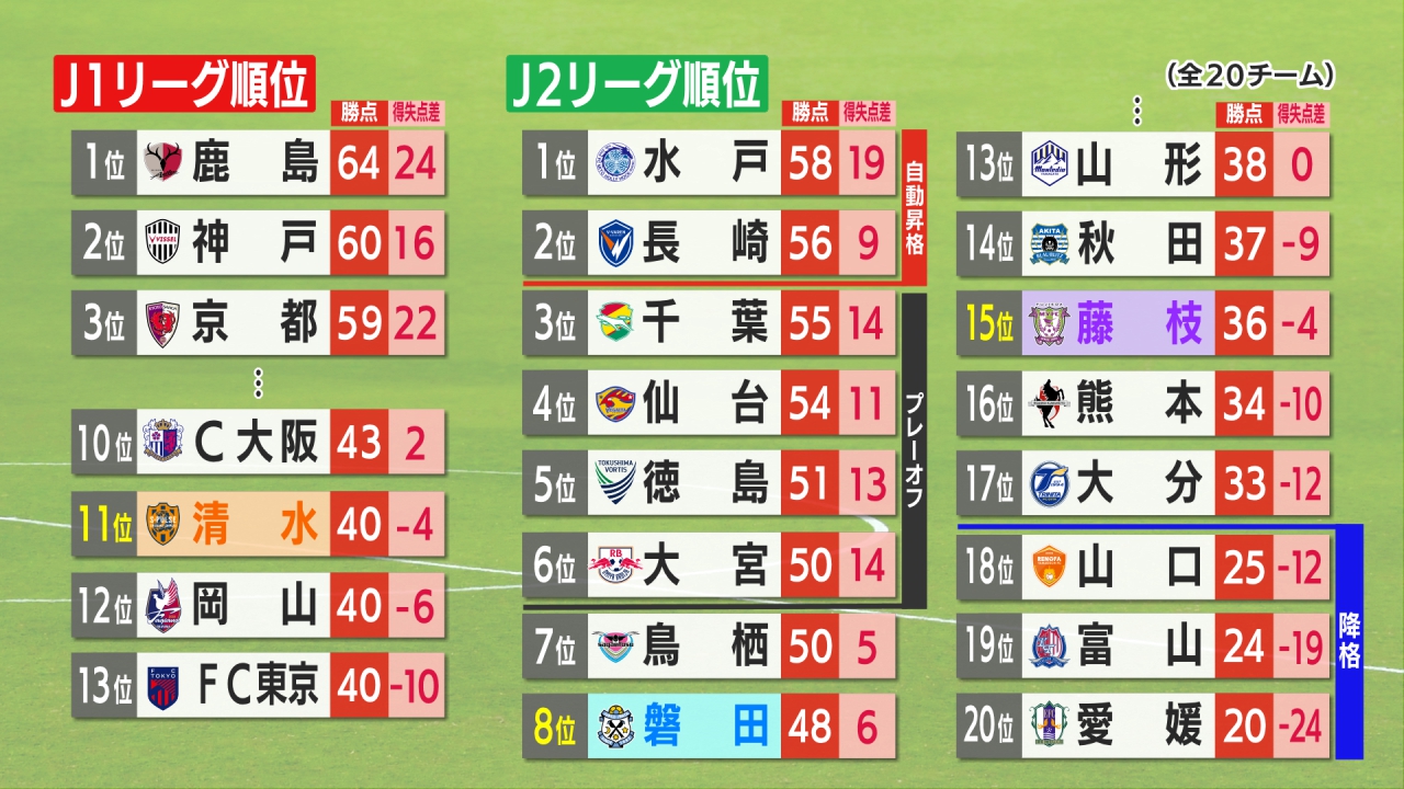 J2はジュビロ磐田がプレーオフ圏内から順位を落として8位。藤枝は15位となっています。