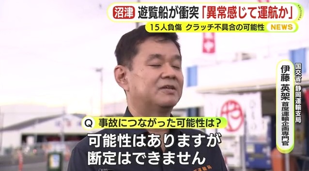10月5日、静岡県の沼津港で遊覧船が岸壁に衝突し15人がケガをした事故で、船長が操船に関わるクラッチに異常を感じながら運航を続けていたと見られることが分かりました。