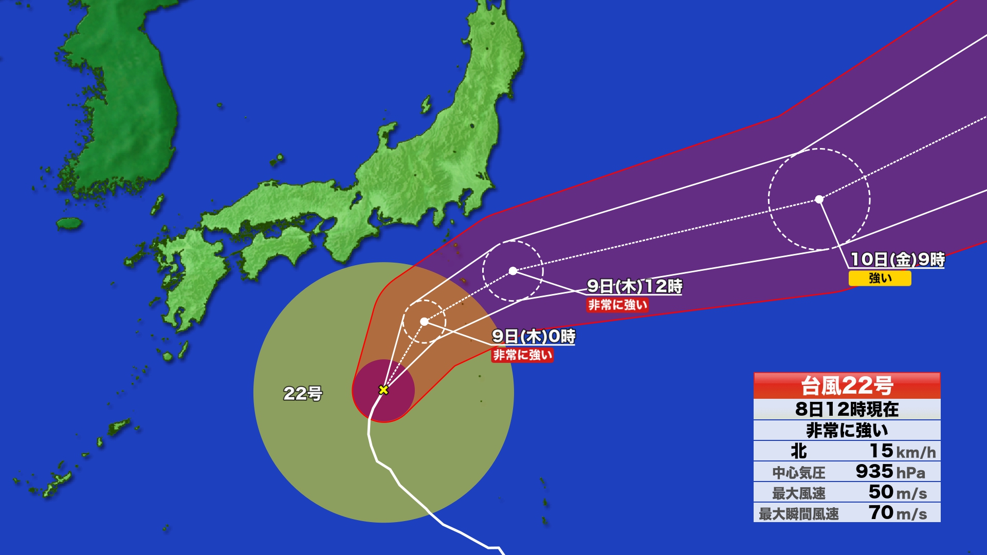 台風は非常に強い勢力を維持しながら8日は進路を次第に東へ変え、9日は伊豆諸島に最も接近する見込みです。