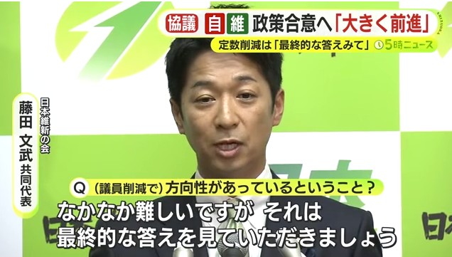 フジテレビの番組に出演した吉村代表は「できなければ連立も合意もしない」と明言。
