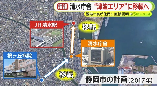 2017年、静岡市が進めていたのは現在の清水庁舎を清水駅前に移転し、当時の桜ヶ丘病院を清水庁舎の場所に新設する計画です。