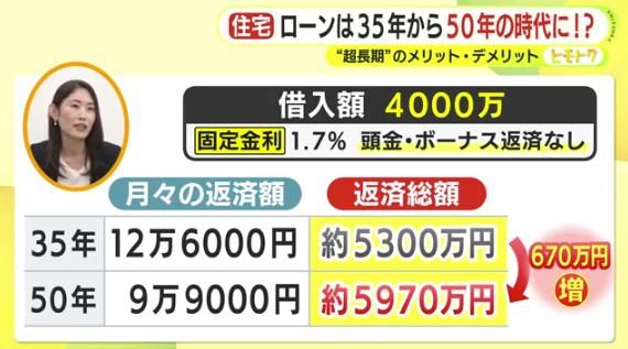例えば金利1.7%で4000万円を借り、いわゆるボーナス返済をなしにした場合、月々の返済額は35年ローンで12万6000円、50年ローンで9万9000円と毎月3万円近い差が生まれます。