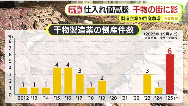 東京商工リサーチによると干物や塩漬けを製造する企業の倒産は2023年は3件、2024年は1件でしたが、2025年は9月までですでに6件に達しています。