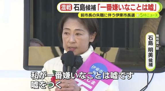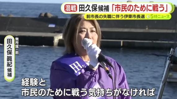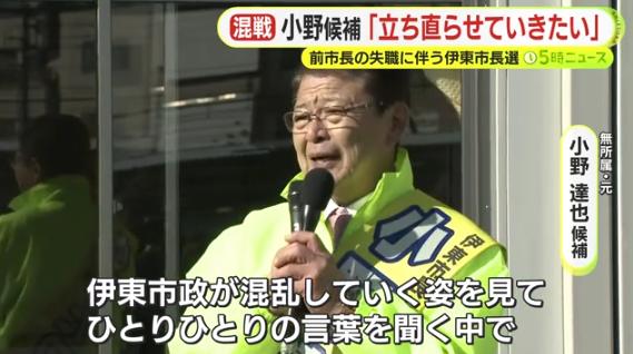 12月7日告示された伊東市長選に立候補したのは届け出順に元観光団体役員の利岡正基 候補(52)、スポーツインストラクターの石島明美 候補(58)、元市長の小野達也 候補(62)、NPO法人代表の岩渕完二 候補(73)、薬局チェーン顧問の黒坪則之 候補(64)、元市議の杉本憲也 候補(43)、前市長の田久保眞紀 候補(55)、元会社員の大野恭弘 候補(58)、マンガ家の鈴木奈々子 候補(52)の9人です。