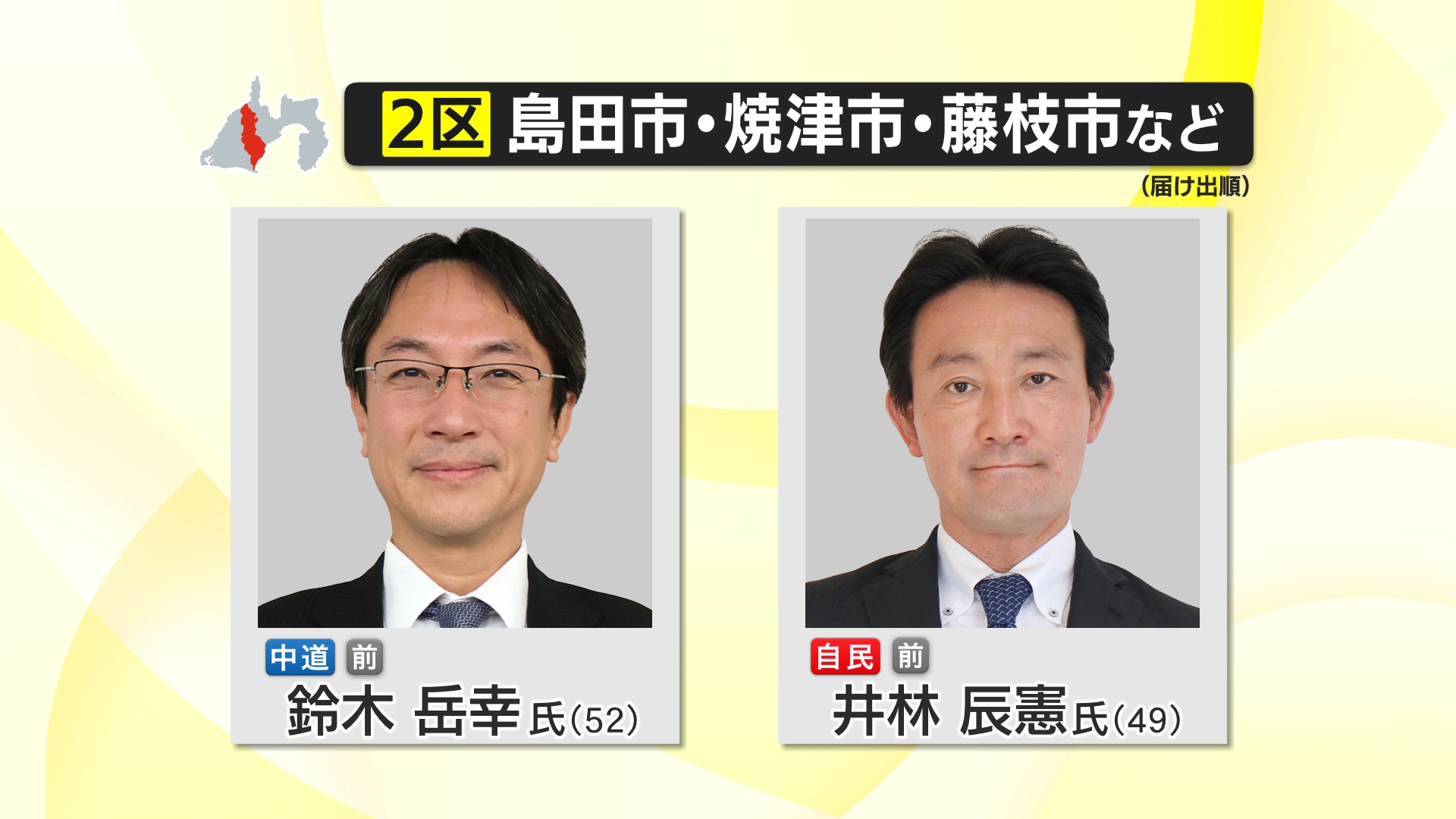 第51回衆議院解散総選挙は2月8日に投票が行われ、各地で開票作業が進んでいる。午後11時30分時点における静岡2区立候補者の得票数は下記の通り。 ■各候補の得票数(選挙区全体) 中道改革連合・鈴木岳幸=6万1038票 自民党・井林辰憲=15万1084票
