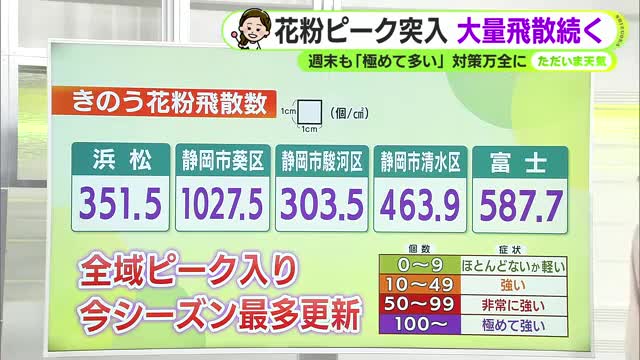 花粉の飛散数、きのう木曜のデータ、静岡市葵区は1000個を超えました。その他も今シーズン最多飛散。ピークを迎えています。