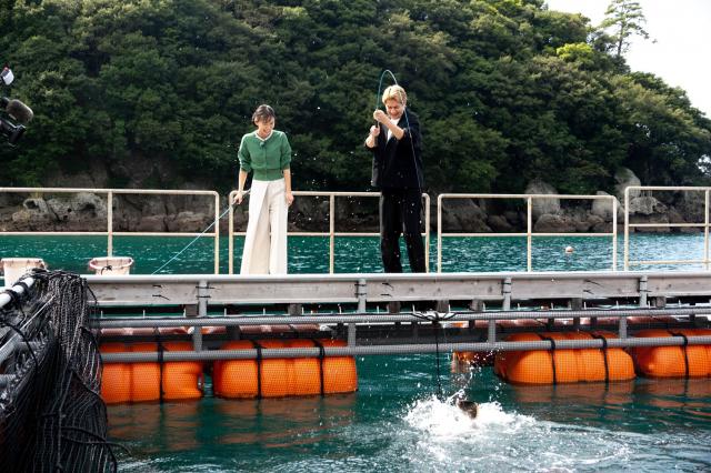 土肥港に到着した2人は、港からすぐそばの去年リニューアルオープンした釣り堀へ。「人気ランチ」をかけた釣り対決に挑戦します! 一番大きい真鯛を釣ったのはJOYさんそれとも音々さん?